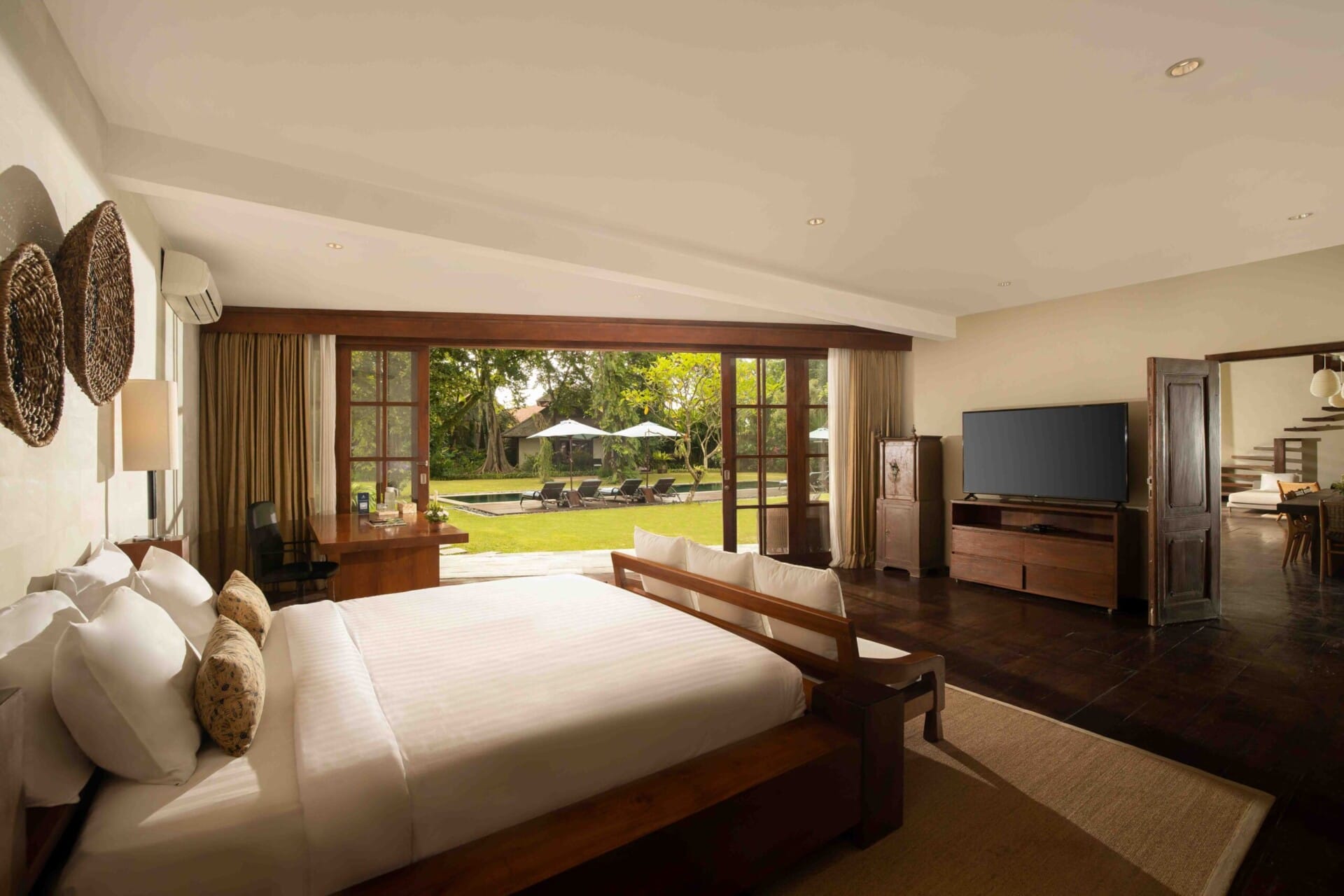 Inside, the villa combines modern amenities with traditional Balinese craftsmanship, featuring an open-plan living area that seamlessly blends indoor and outdoor spaces. Guests can unwind in the cozy lounge or enjoy a movie night in the entertainment room.